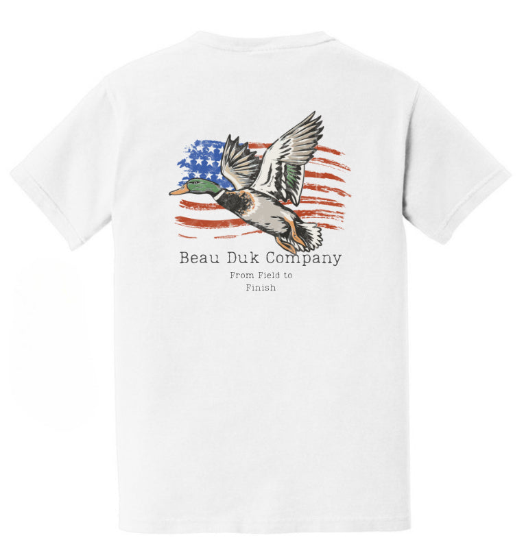 The American Pride T is a white t-shirt that features a striking image of a duck flying through the American flag. Show off your love for the US while staying comfortable and stylish. Perfect for any patriot or bird enthusiast. Printed on a Comfort Colors shirt that is 100% cotton and proudly made in America, it’s built for comfort, durability, and long days under open skies.